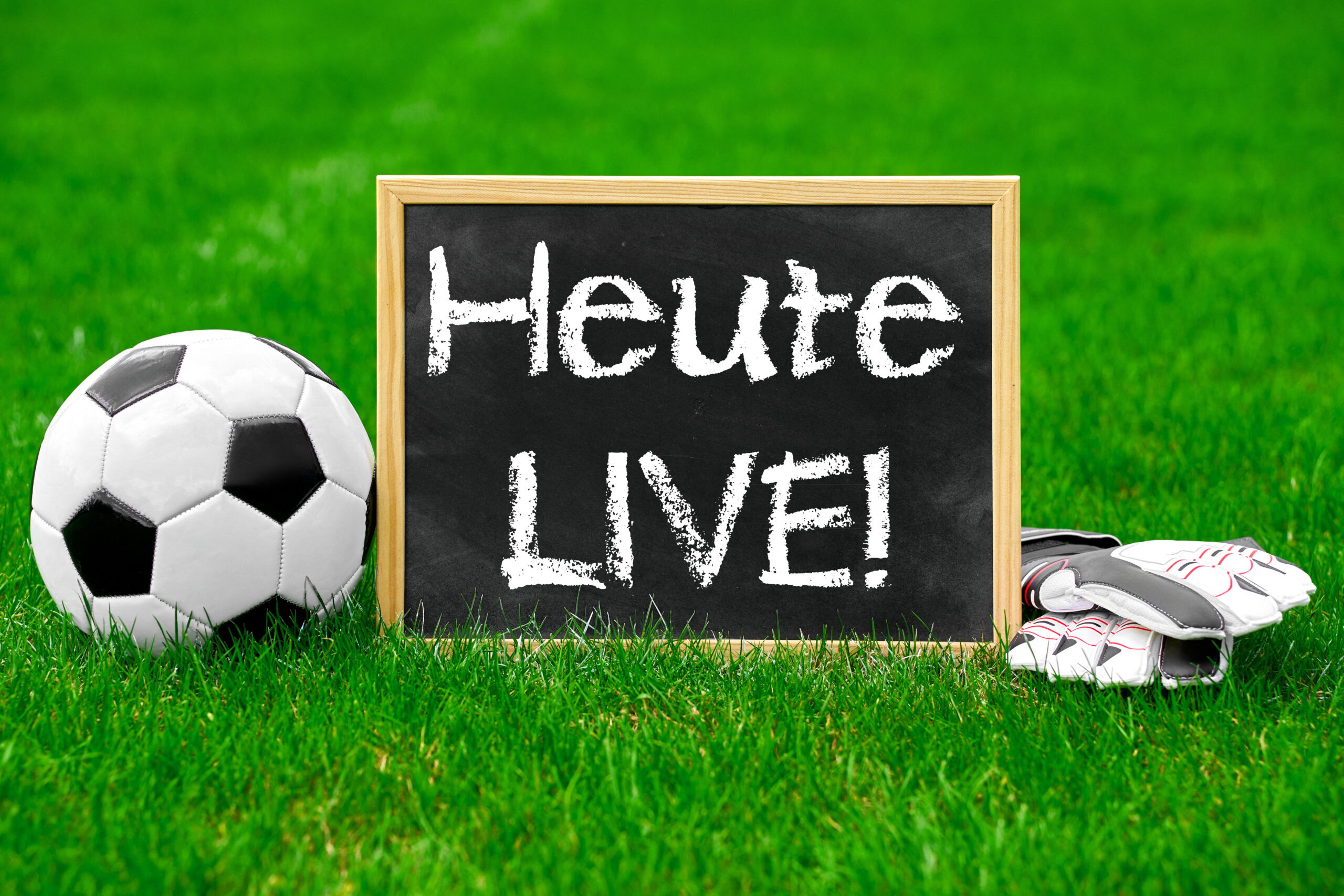 Heute Live Übertragung bedeutet, dass ein aktuelles Fußballspiel direkt und in Echtzeit gezeigt wird. Das Bild zeigt ein Schild mit der Aufschrift „Heute LIVE!“ auf grünem Rasen, daneben liegen ein Fußball und Torwarthandschuhe als klare Symbole für den Spieltag. Der Hinweis auf die heutige Live-Übertragung richtet sich an Fans, die Fußball heute live im TV oder im Stream verfolgen möchten und sich über Anstoßzeiten sowie aktuelle Spiele informieren. Solche Motive rund um eine Heute Live Übertragung verbinden die Spannung eines Spieltags mit der direkten Berichterstattung und machen deutlich, dass das Fußballspiel live ausgestrahlt wird.