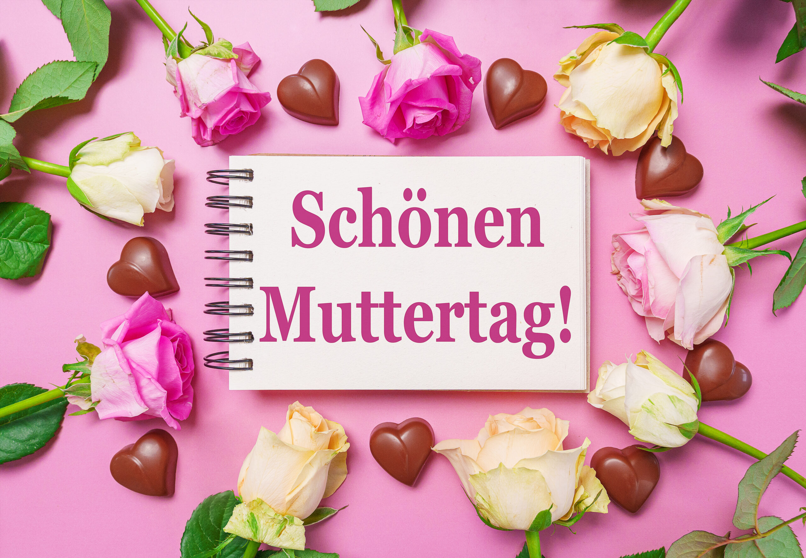 Ein Spiralblock mit der Aufschrift „Schönen Muttertag!“ liegt umgeben von Rosen und Pralinen auf rosa Untergrund. Das Muttertagsbild wirkt zart, freundlich und festlich.