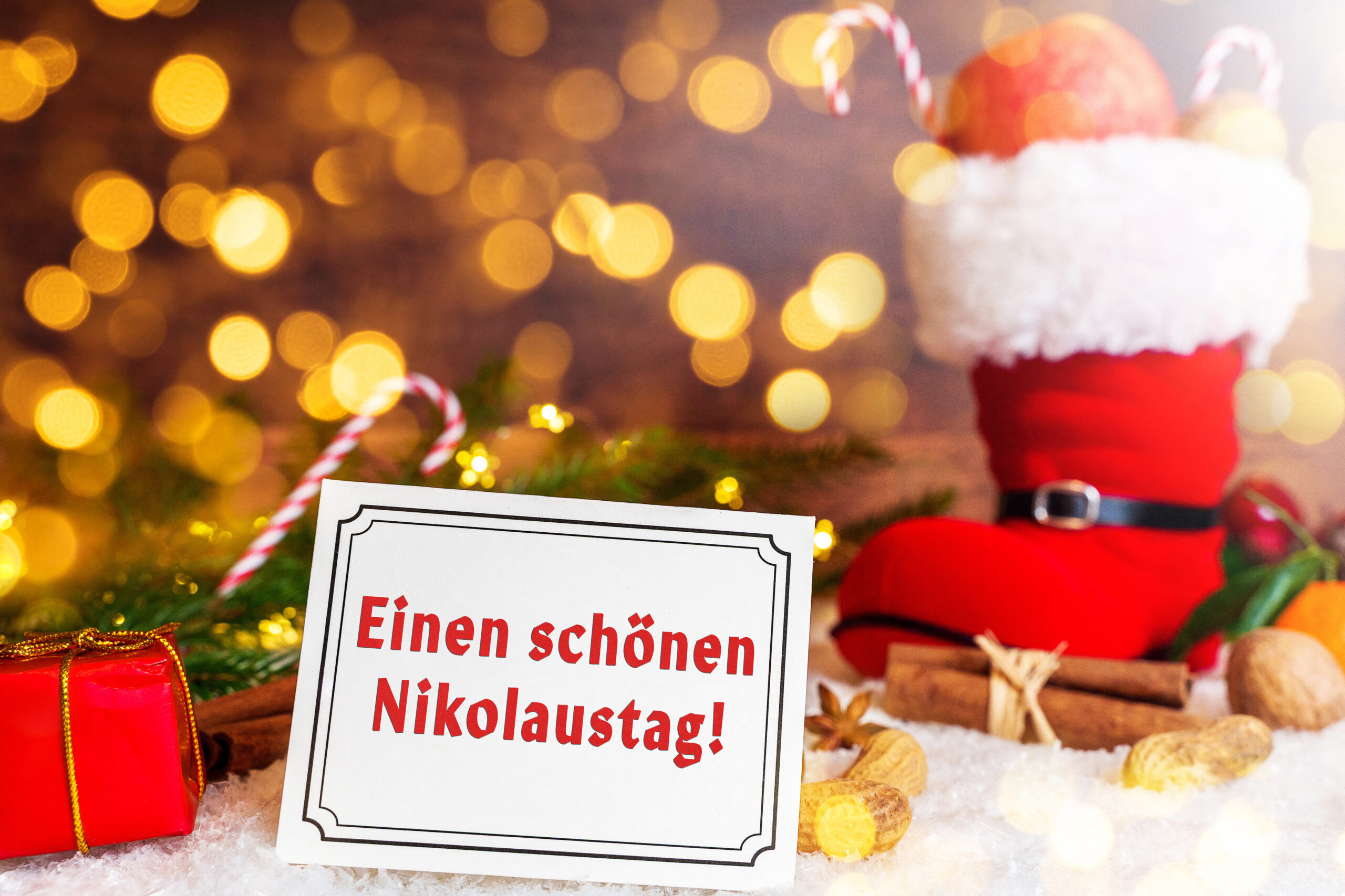 Dieses stimmungsvolle Nikolausbild zeigt eine Karte mit der Aufschrift „Einen schönen Nikolaustag!“ vor einer festlichen Kulisse. Neben dem Gruß stehen ein roter Nikolausstiefel, Nüsse, Zimtstangen, ein kleines Geschenk und grüne Tannenzweige auf einer Schneefläche. Im Hintergrund sorgen goldene Lichtpunkte für eine warme, gemütliche Atmosphäre. Das Motiv vermittelt Freude und Herzlichkeit zum Nikolaustag, der traditionell am 6. Dezember gefeiert wird. Es steht für weihnachtliche Grüße, Nikolausbilder und festliche Dekoration, die den Zauber des Nikolaustages und die Vorfreude auf Weihnachten zum Ausdruck bringen. Ein liebevoll gestaltetes Bild, das den Nikolausgruß in klassischer Weihnachtsstimmung zeigt.