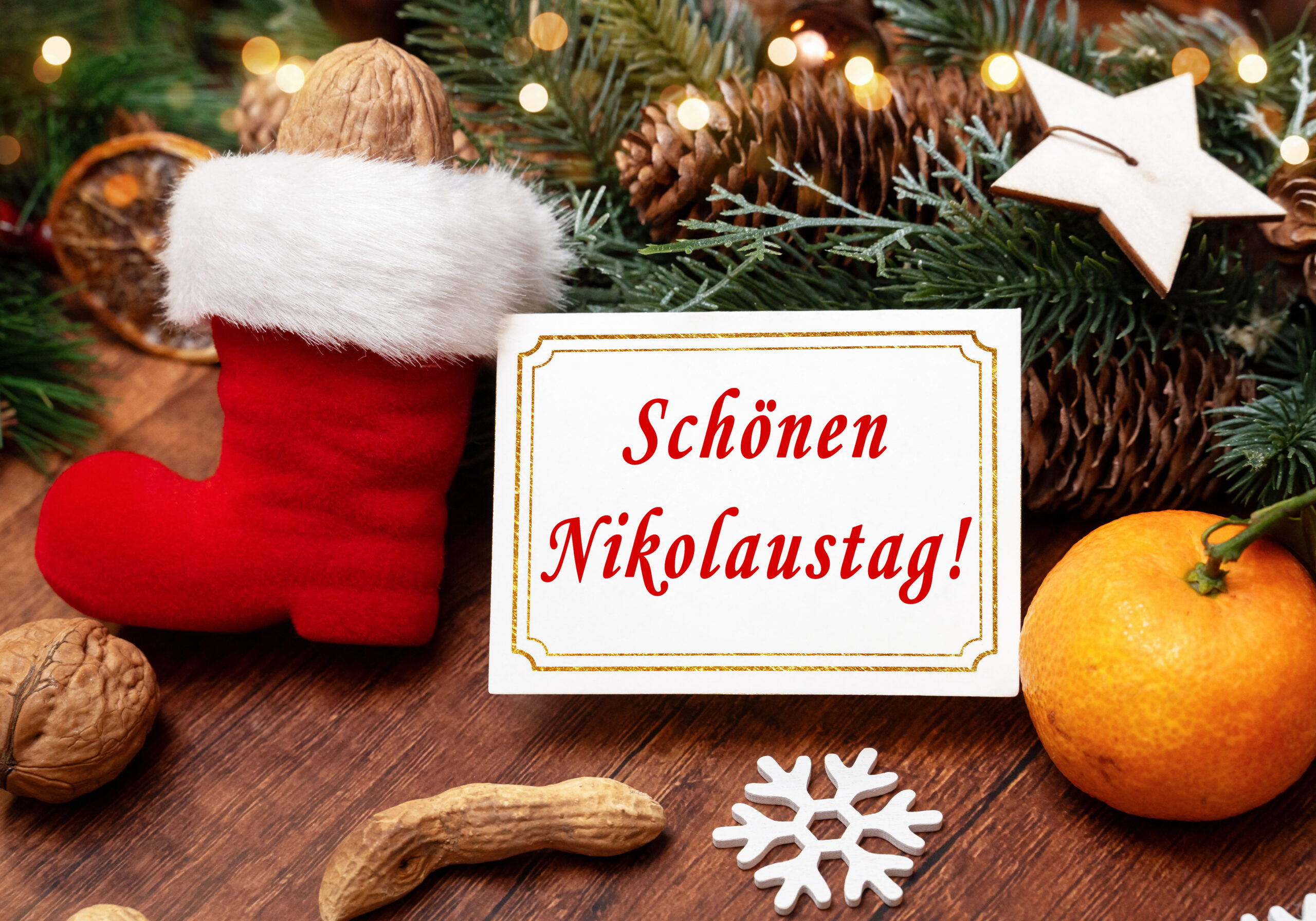 Dieses festliche Nikolausbild zeigt eine weiße Karte mit der roten Aufschrift „Schönen Nikolaustag!“, umgeben von klassischer Nikolausdekoration. Ein roter Stiefel mit weißem Rand steht neben Tannenzweigen, Zapfen, Walnüssen, Erdnüssen, einer Mandarine und einem weißen Schneeflockenanhänger auf einem Holztisch. Warme Lichter und natürliche Farben verleihen dem Motiv eine gemütliche, winterliche Stimmung. Das Bild vermittelt Freude und Herzlichkeit zum Nikolaustag und erinnert an den traditionellen Brauch, Stiefel zu befüllen und kleine Aufmerksamkeiten zu verschenken. Es steht für liebevolle Nikolausgrüße, festliche Stimmung und klassische Nikolausbilder, die den 6. Dezember als besonderen Tag im Weihnachtsmonat zeigen.