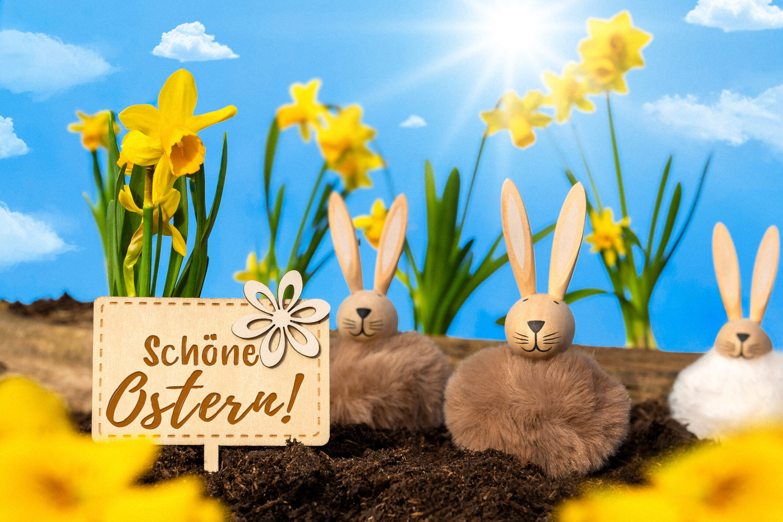Dieses Schöne Ostern Bild zeigt drei Osterhasen vor leuchtenden Narzissen und einem dekorativen Schild mit der Aufschrift „Schöne Ostern“ in einer typischen Frühlingsszene. Schöne Ostern Bilder gehören zu den beliebtesten Osterbildern und werden häufig zusammen mit klassischen Ostergrüßen, Frohe Ostern Motiven und bunten Frühlingsbildern gesucht, da sie die fröhliche Stimmung rund um Ostern mit Osterhasen, Blumen und hellem Sonnenlicht besonders lebendig darstellen.