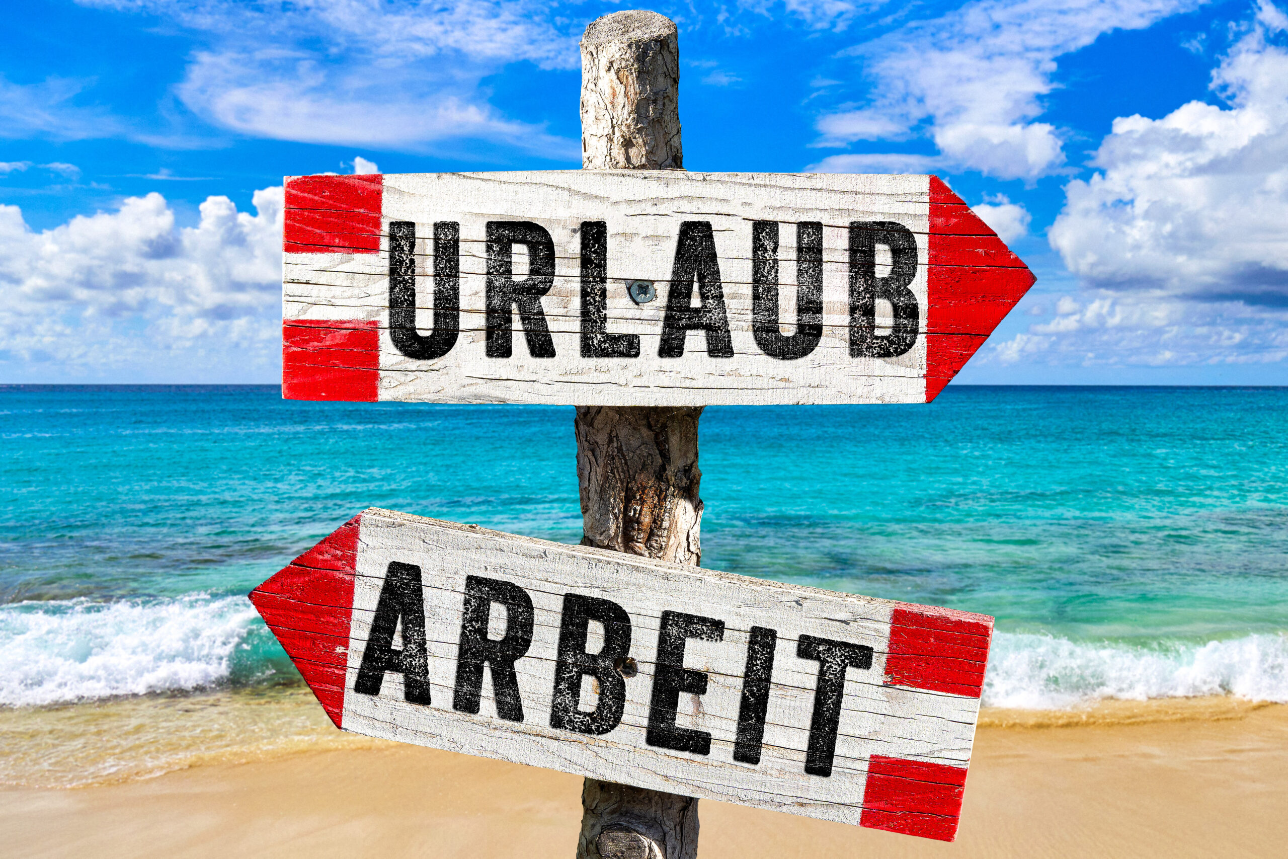 Urlaub Arbeit Schild am Strand: Zwei verwitterte Holzpfeile mit den Worten „URLAUB“ und „ARBEIT“ sitzen auf einem Pfosten vor türkisfarbenem Meer. Rote Spitzen und grobe Holzstruktur lassen die Richtung klar wirken, der Himmel mit Wolken hält die Szene hell und freundlich. Der Kontrast betont die Wahl Urlaub oder Arbeit und macht den Hinweis sofort verständlich. Als schlichtes Urlaub Schild und Arbeit Schild funktioniert das Motiv wie ein klarer Wegweiser beziehungsweise Hinweisschild am Meer. Ein direktes, gut lesbares Bild rund um Urlaub, Arbeit und Richtungspfeile am Strand.