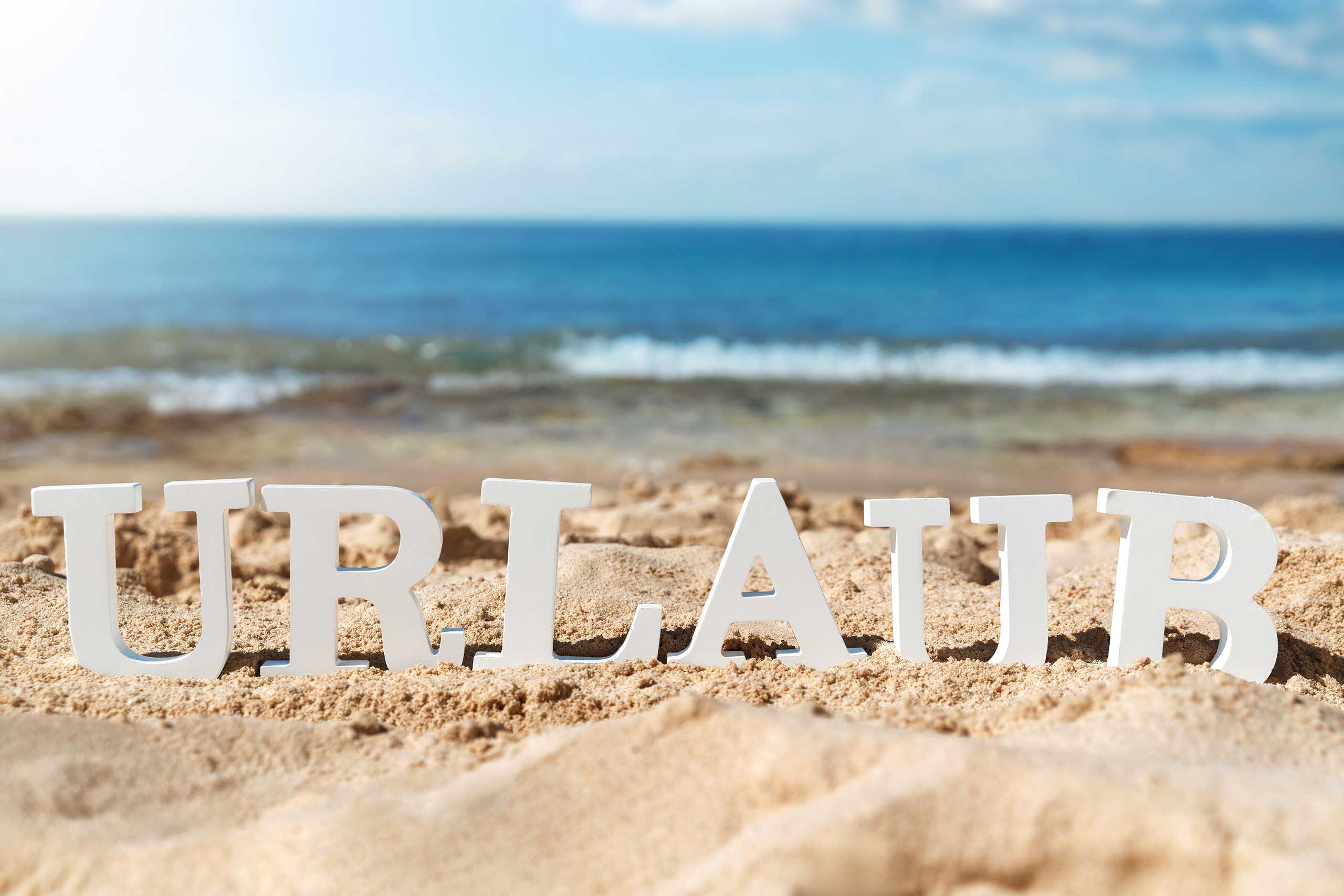 Urlaub Schriftzug aus weißen Buchstaben im warmen Sand eines Strandes mit leicht unscharfem Meer im Hintergrund steht für Sommer, Ruhe und Erholung. Dieses Urlaub Bild konzentriert sich auf den klaren Schriftzug im Vordergrund und kombiniert minimalistisches Design mit klassischer Strandszene. Als Urlaubsbild transportiert das Motiv die typische Stimmung von Auszeit, Reise und sonnigen Tagen am Meer.