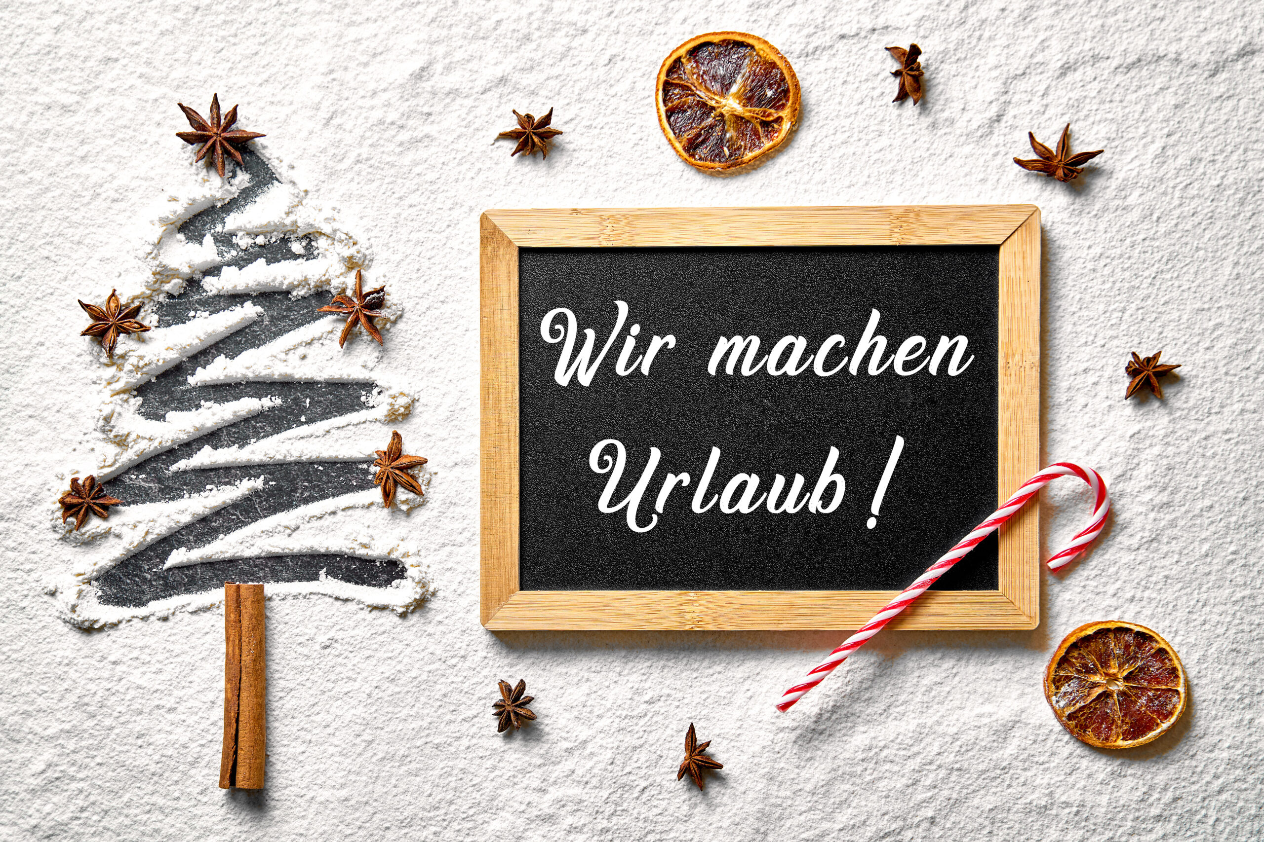 Weihnachtsurlaub mit klarer Botschaft: „Wir machen Urlaub!“ steht in heller Schrift auf einer kleinen Tafel. Der Untergrund wirkt wie frisch bestäubter Schnee; Zimt, Sternanis, Orangenscheiben und Zuckerstange setzen weihnachtliche Akzente. So entsteht ein eindeutiger Hinweis auf Urlaub Weihnachten und Urlaub zu Weihnachten – schlicht, freundlich und gut lesbar. Die Kombination aus Tafeltext und Gewürzen verweist direkt auf Betriebsurlaub Weihnachten, Advent und Winterzeit. Fokus bleibt auf Weihnachtsurlaub in Verbindung mit „Wir machen Urlaub“, festlich und reduziert.