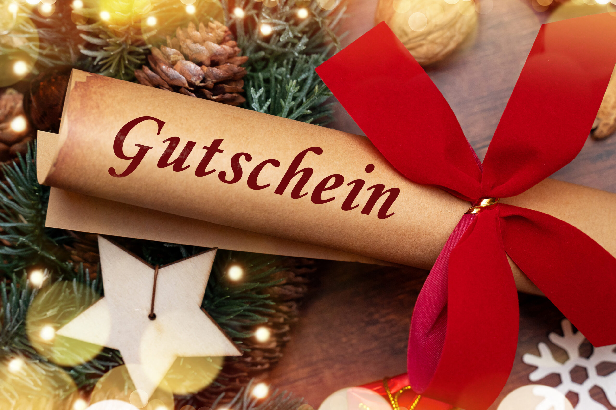 Ein festliches Weihnachtsmotiv mit einer gerollten Karte, auf der das Wort Gutschein in eleganter Schrift zu lesen ist. Die rote Schleife, das warme Licht und die weihnachtlichen Details wie Tannenzweige, Holzsterne und Zapfen schaffen eine harmonische Atmosphäre. Das Bild fängt den Zauber der Weihnachtszeit ein und verbindet klassische Farben und Symbole der festlichen Saison zu einer stilvollen Komposition.